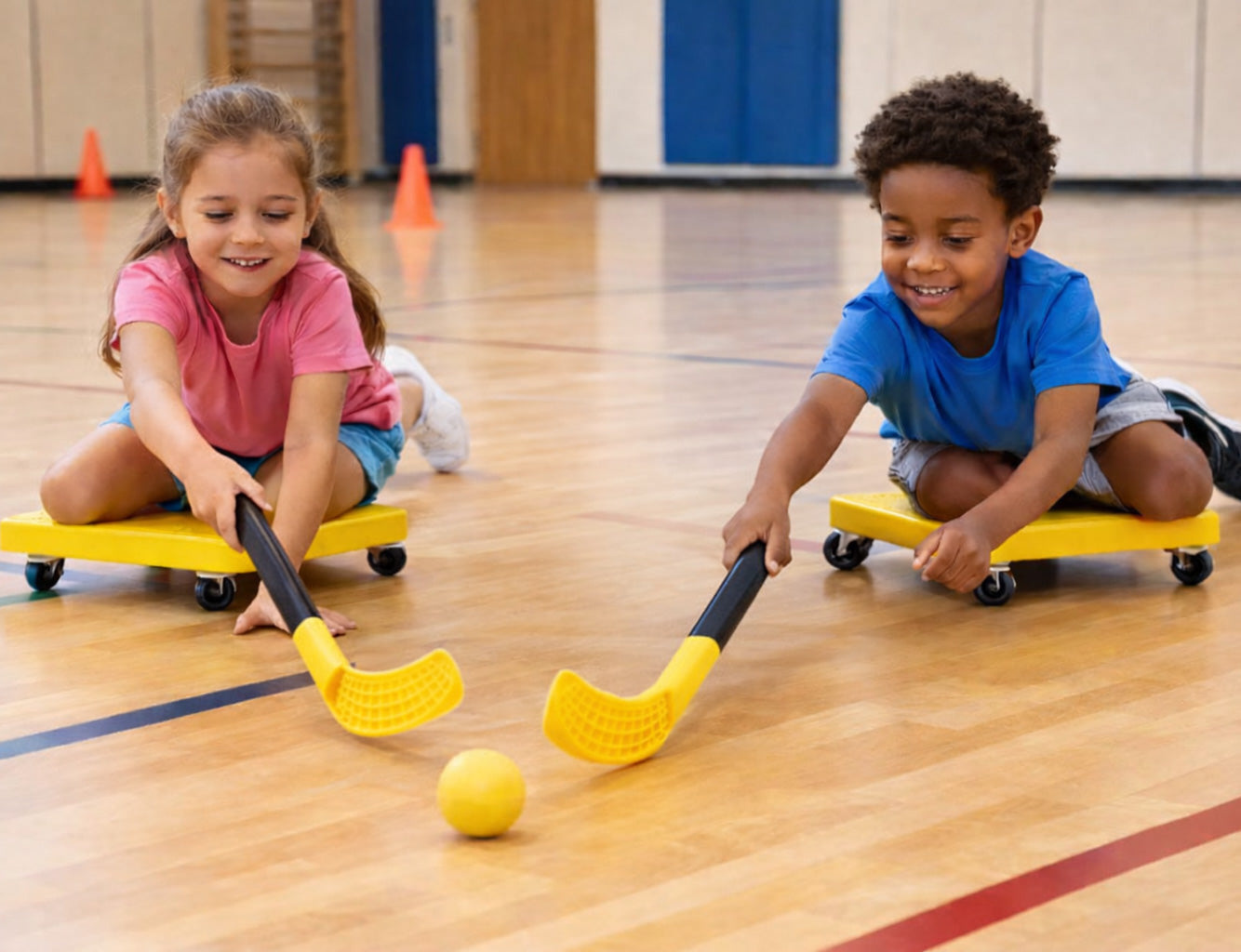 Scooter Hockey is a fun team game where players sit or kneel on Scooter Boards and use Scooter Board Hockey Set. All movement is done while staying on the scooterboard, encouraging controlled scooting and teamwork rather than speed. Players work together to pass, defend, and score while keeping sticks low and movements slow to ensure safety.